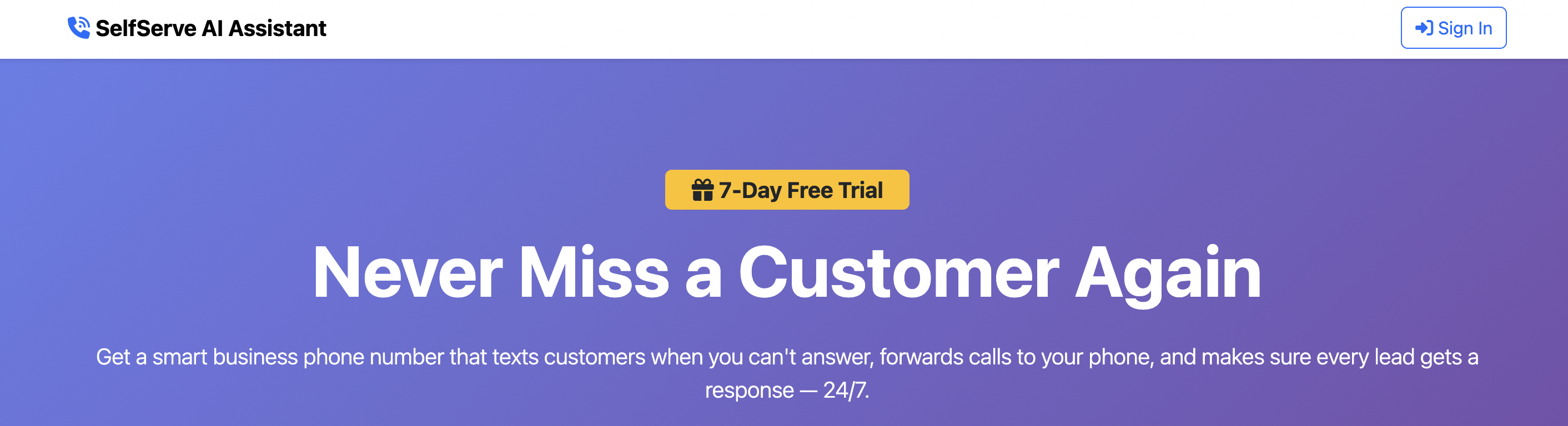 Simple self serve AI assistant that answers your calls with a text response so you don't miss that important call or your next client.