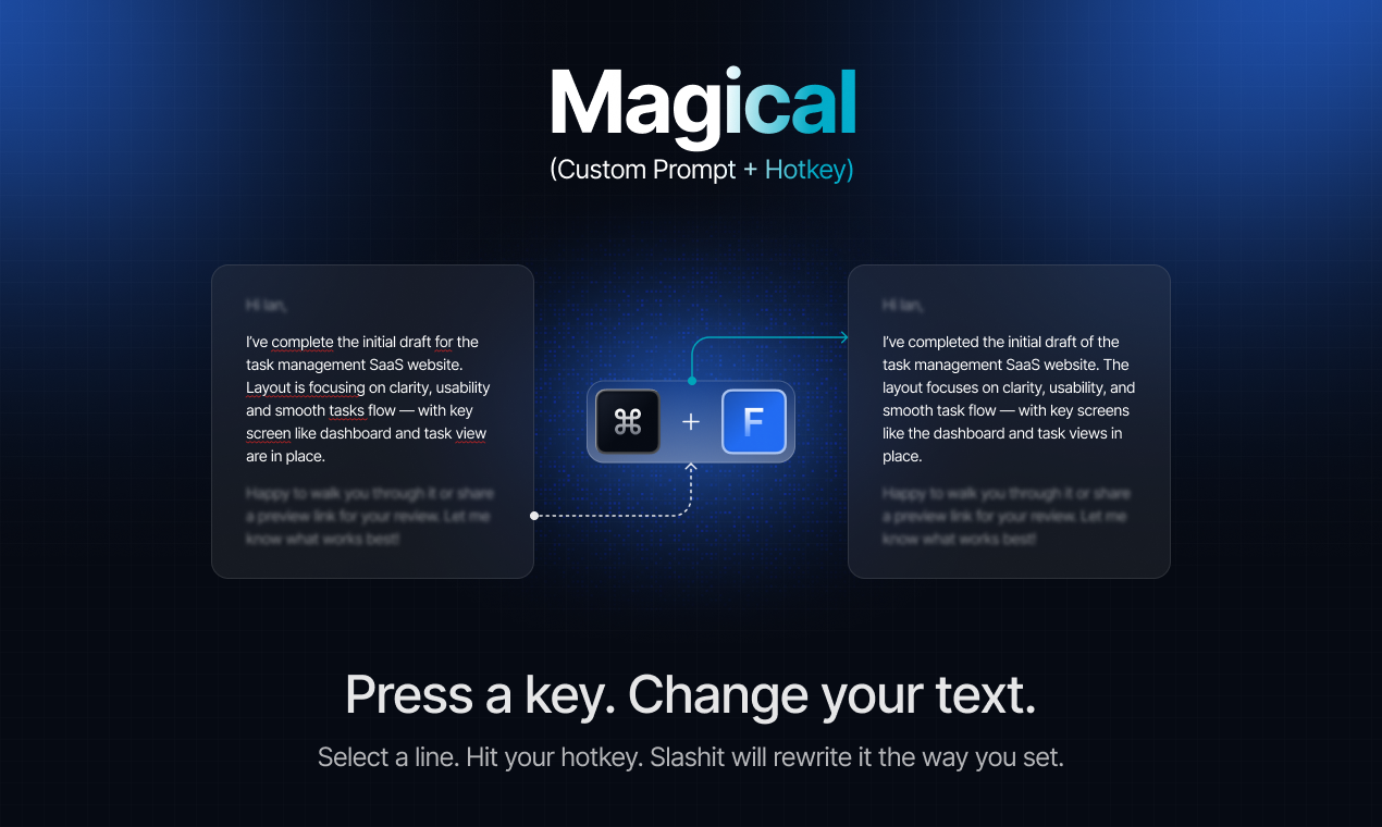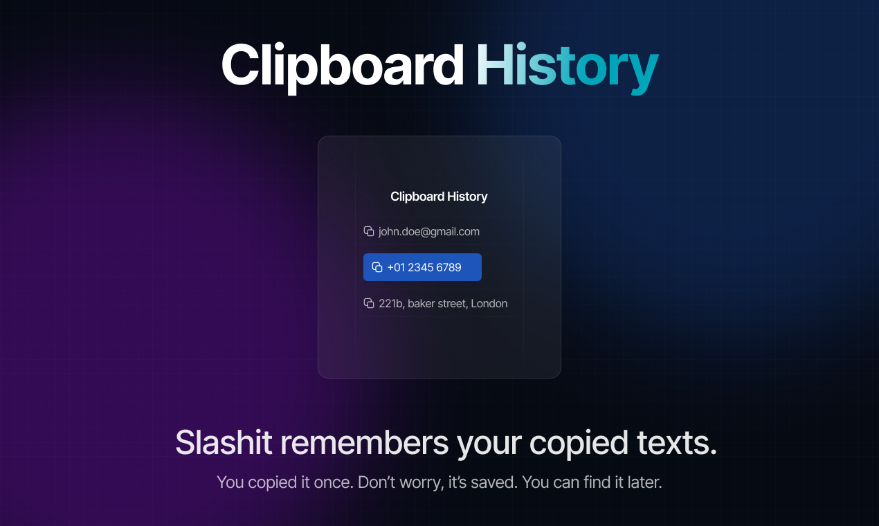 We built Slashit because we were tired of typing the same message/mail/comment again and again. If you write replies, fill forms, or send emails all day, this is for you. Slashit helps you: • Create dynamic templates with placeholders • Turn short text into full messages with Snippets (like typing “tks” to get “Thank you so much!”) • Use AI in your template to auto write parts for you • Set your own magic hotkeys (select text → press key → text changes based on your prompt) • See and reuse anything you copied with Clipboard History It works anywhere you can type, web, apps, tools, wherever you have input field. Most importantly you can customize everything: shortcuts, hotkeys, AI prompts, all the way you like. Our goal? Help you write faster, save time, and stop typing the same sentence ten times a day. We use it daily and it really helps, hope it does the same for you.