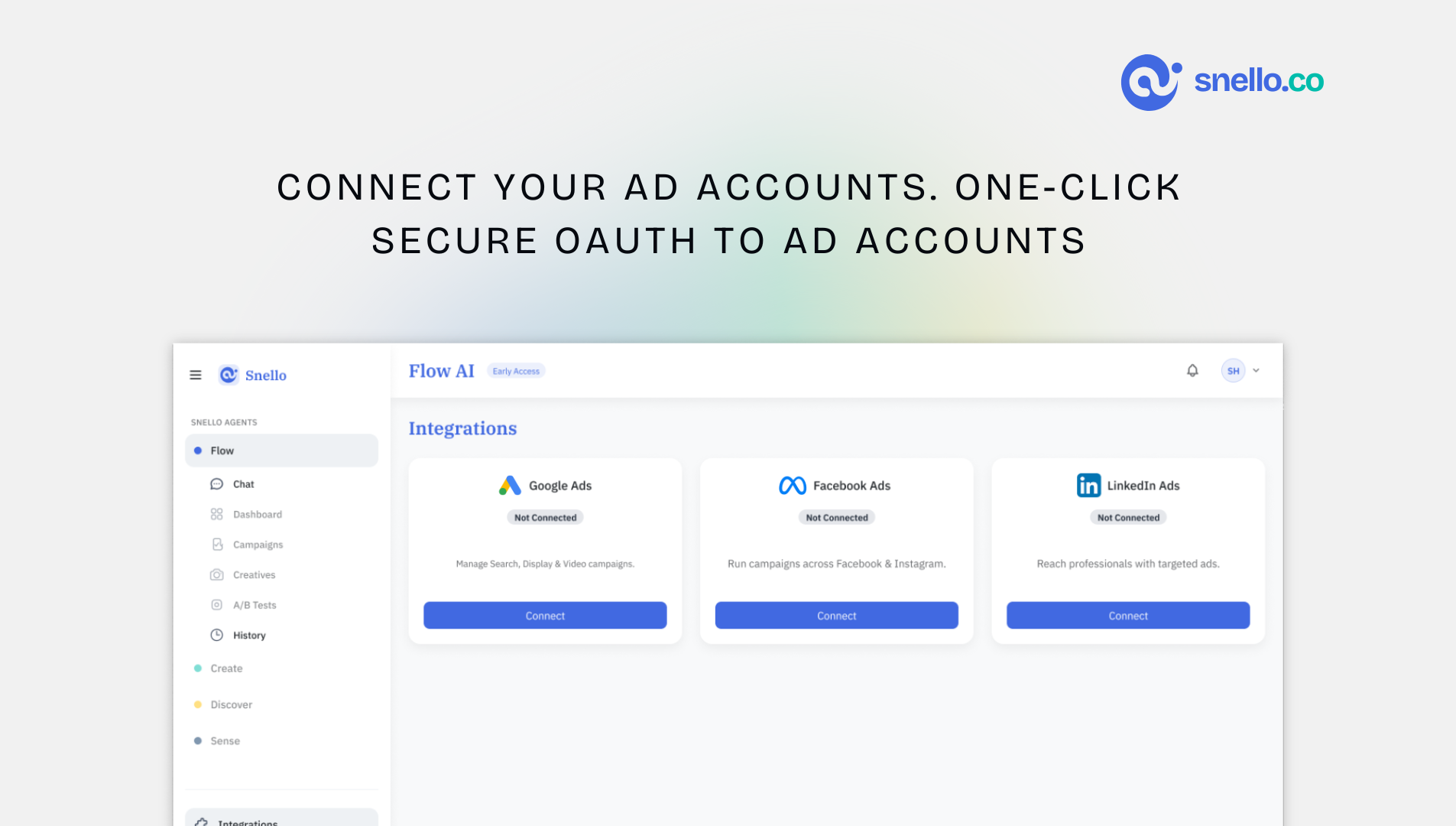 Snello Flow is an AI Performance Marketer. Yes, you don't need to hire a Performance Marketer or Marketing Agency anymore. Brainstorm ideas Create and run campaigns Monitor Performance 24x7 Automati