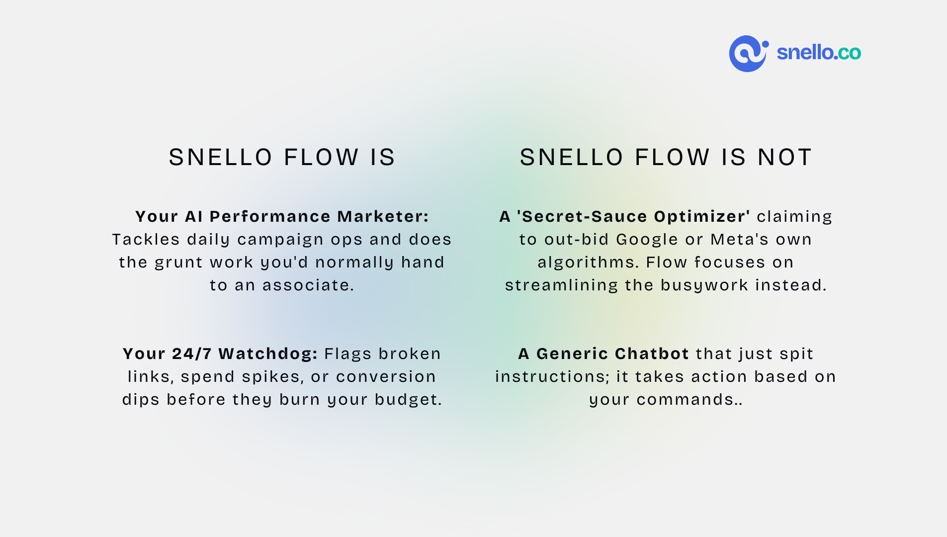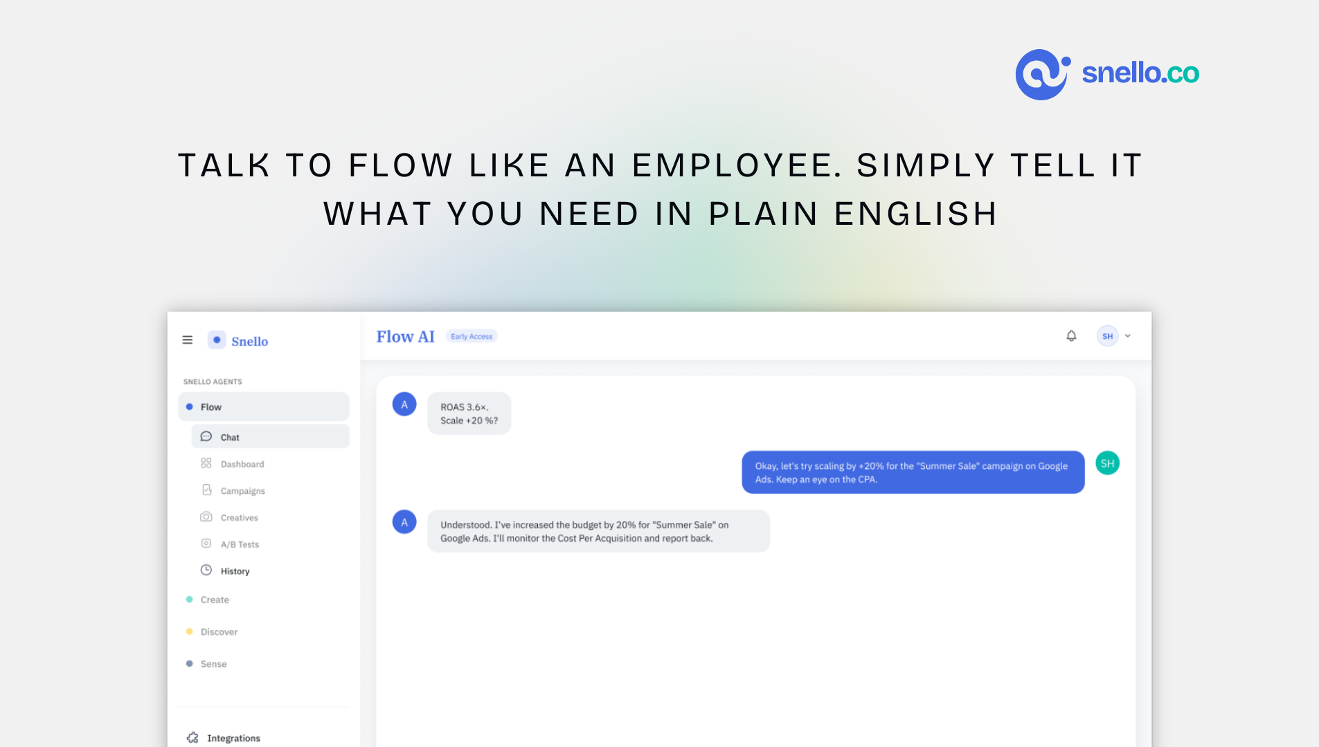 Snello Flow is an AI Performance Marketer. Yes, you don't need to hire a Performance Marketer or Marketing Agency anymore. Brainstorm ideas Create and run campaigns Monitor Performance 24x7 Automatically adjust spends to increase ROAS! Checkout for free now!