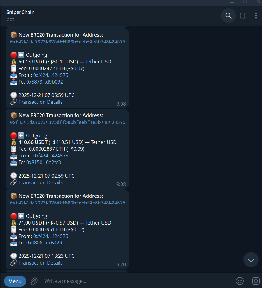 SniperChain is an all-in-one crypto monitoring bot that sends real-time alerts directly to Telegram — no dashboards, no tabs, no noise. Traders use it to react faster to market-moving events like new exchange listings, whale transfers, gas spikes and fresh liquidity pools. ⚡ Real-time exchange listing alerts (2–5s detection) 🐋 Whale & large wallet tracking 💧 DEX liquidity pool detection (Uniswap, PancakeSwap) ⛽ Gas price alerts 👛 Multi-wallet monitoring (Ethereum & Solana) 📲 Instant Telegram notifications 💳 Stripe subscriptions for premium alerts Already used by 1,000+ traders.