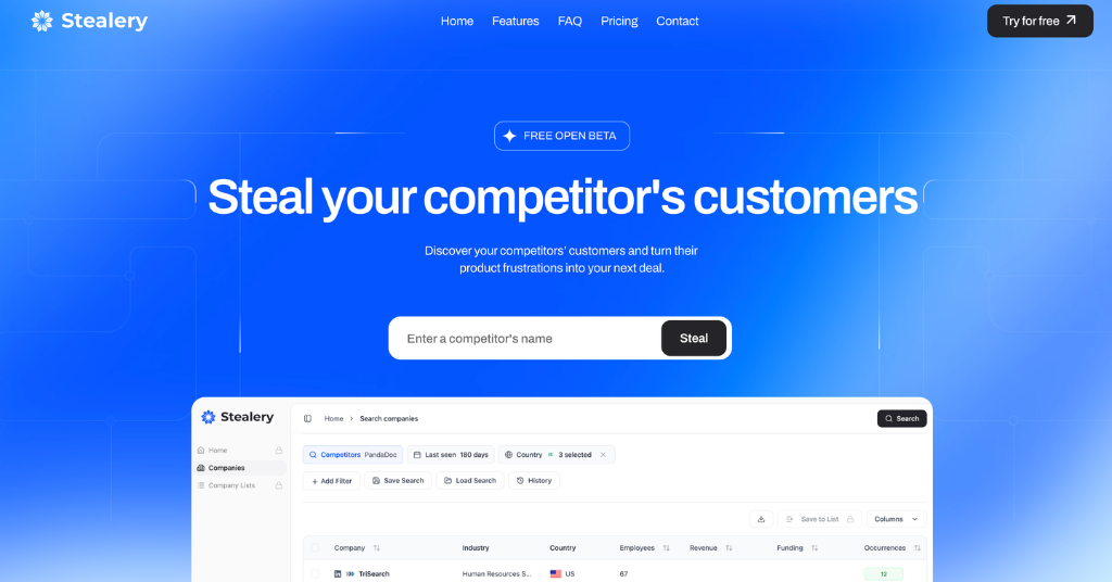 Your competitors' frustrated customers are your warmest leads. They're already complaining. Already Googling alternatives. Already halfway out the door. Stealery finds companies using your competitors' tools, so you reach out at the exact moment they're ready to switch. No convincing. No educating. Just "we fix exactly what's been driving you crazy." 3x reply rates. 2x more meetings. Prospects who pick up because they've been waiting for your call. Their frustration is your pipeline.
