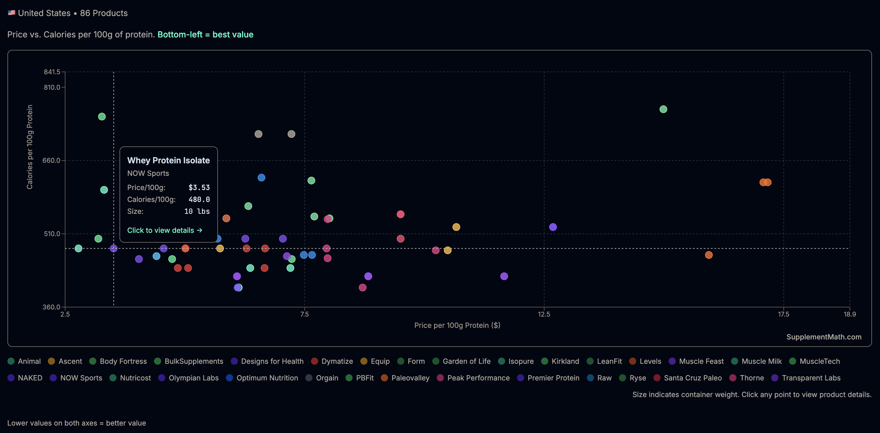 Protein powder labels are designed to mislead. Brands display "$2.99 per serving" on the front while hiding the 67g scoop size in fine print. You're paying for fillers, not protein. SupplementMath pulls actual nutrition data and calculates what you actually care about: cost per 100g of protein and calories per 100g of protein. What you get: - Database of 300+ powders with real cost calculations - Scatter chart showing price vs calories to spot value outliers - Educational guides on whey isolate vs concentrate, plant proteins, sweeteners - Calculators to check any tub against the database - Multi-market support (US and UAE, more coming) - Works in the US and UAE with local pricing and Amazon links