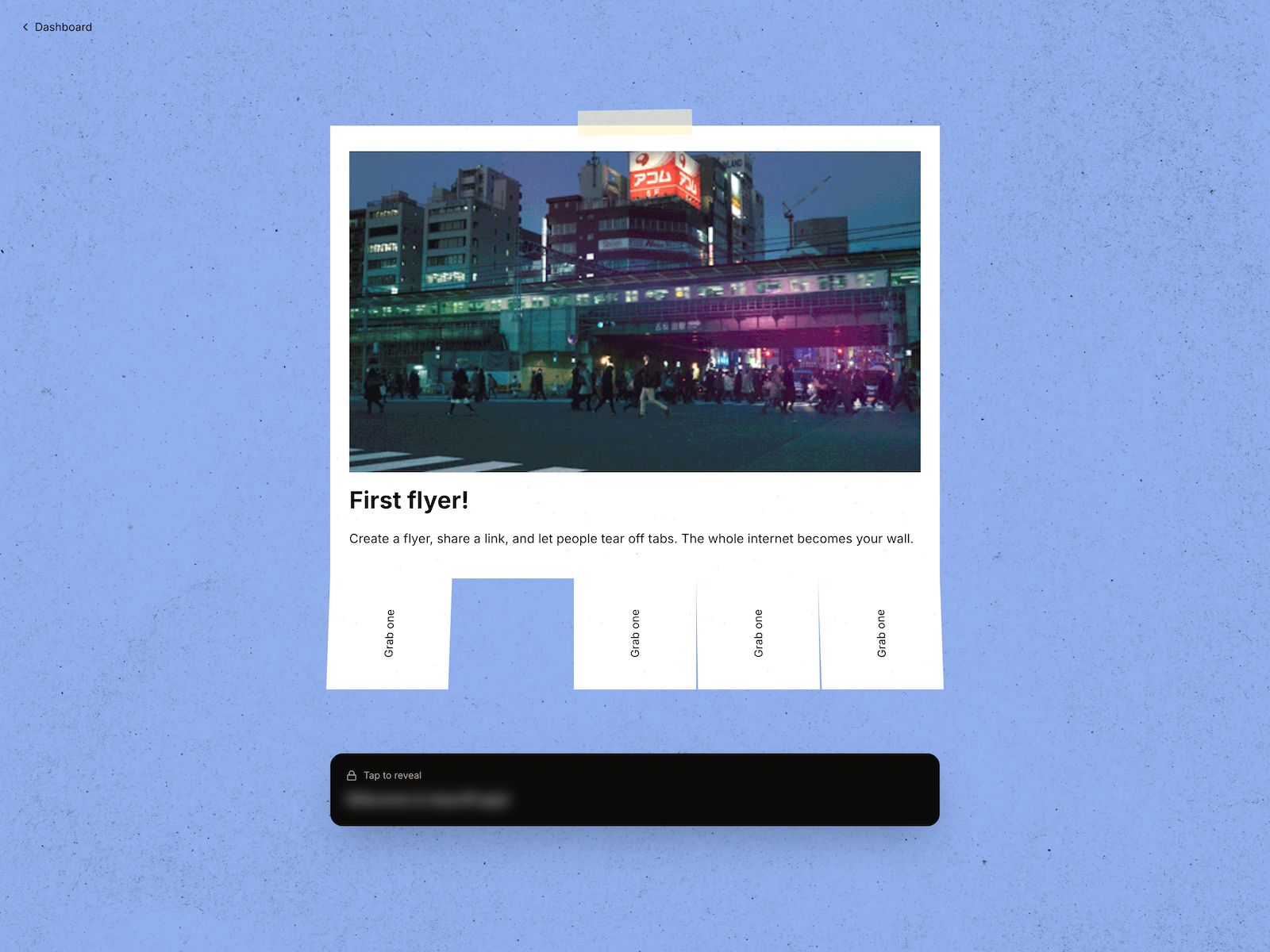 Tearoff brings the classic paper flyer with tear-off tabs to the internet. Create a digital flyer, add tabs with discount codes, hidden messages, access links, or contact info, and share it as a single link. When someone grabs a tab, it's gone for everyone.