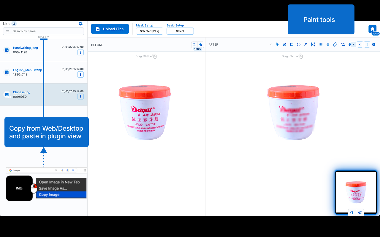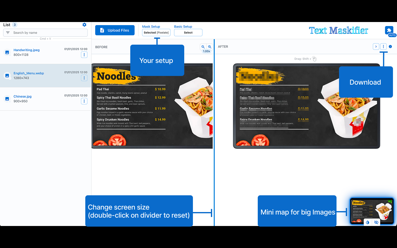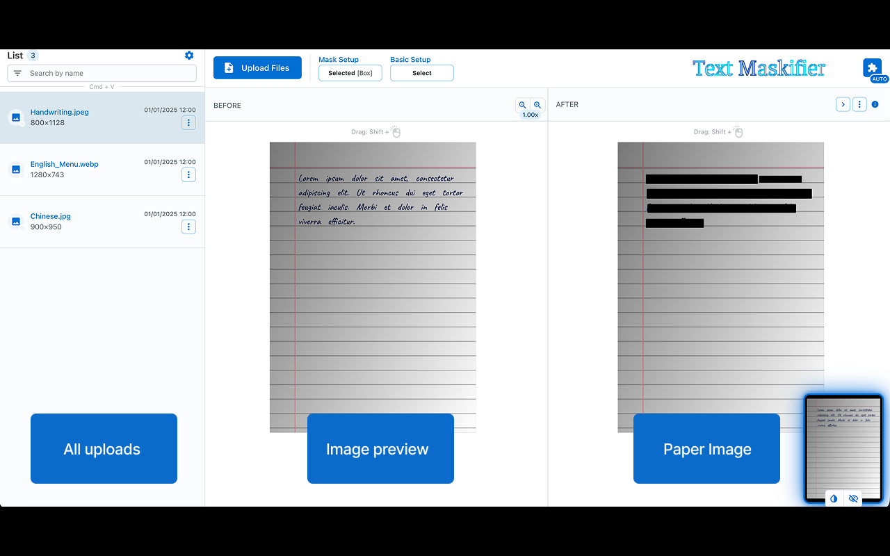 Text Maskifier improves your workflow by applying customizable masks on detected text in images, and enabling secure downloads, ensuring your data stays private and offline. Features: • ⚡ Performance: quickly detects the text on images without delays(file not sent to internet). • 🎯 Precision: delivers highly accurate results. • 🔒 Offline Functionality: operates entirely offline, ensuring your data stays private. • 🌍 Multilingual: can mask multiple languages. • 🎨 Edit: you can delete, move and rotate mask. • 🔄 Text Rotation Detection: captures and processes rotated text. • ✨ Extra Options: output size control, watermarking (image/signature), metadata handling, and format selection. Shortcuts: • Paste files from your clipboard for processing: Ctrl/Cmd + V • Copy the modified selection to your clipboard: Ctrl/Cmd + Shift + C Note: compatibility may vary across devices 😢.