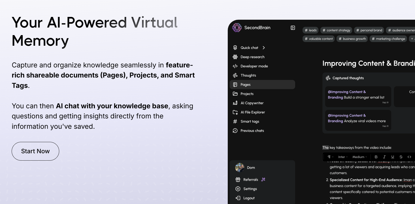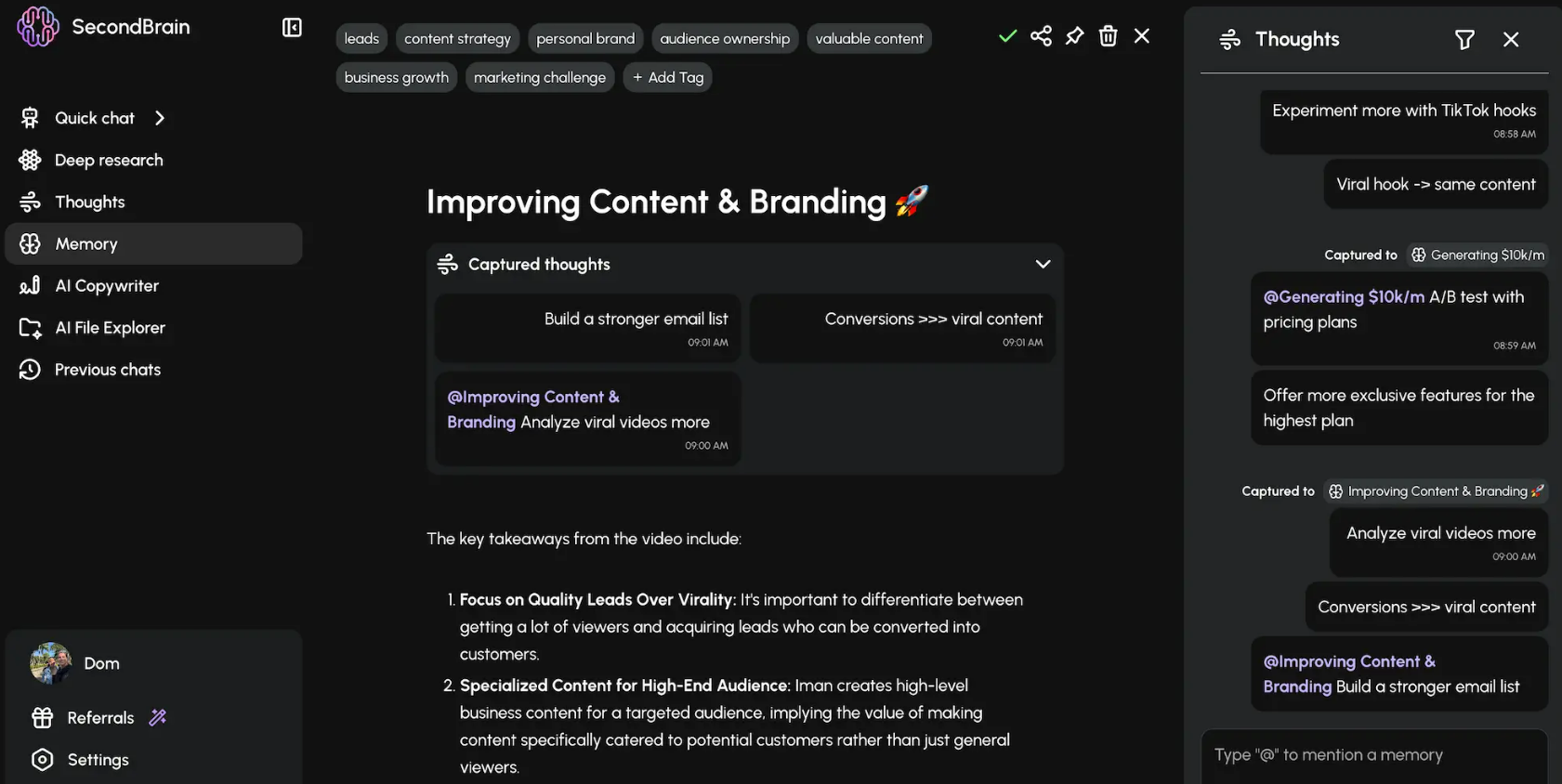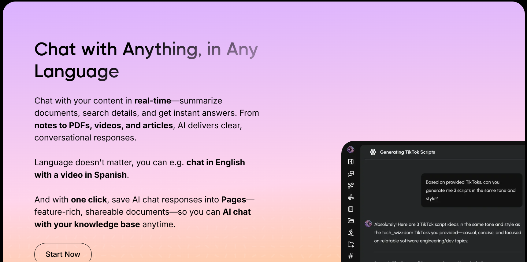 Effortlessly chat with your documents, TikToks, IG Reels, YouTube videos, X, Audio, Looms, PDFs, websites, and more—summarize, search, and interact with your content.