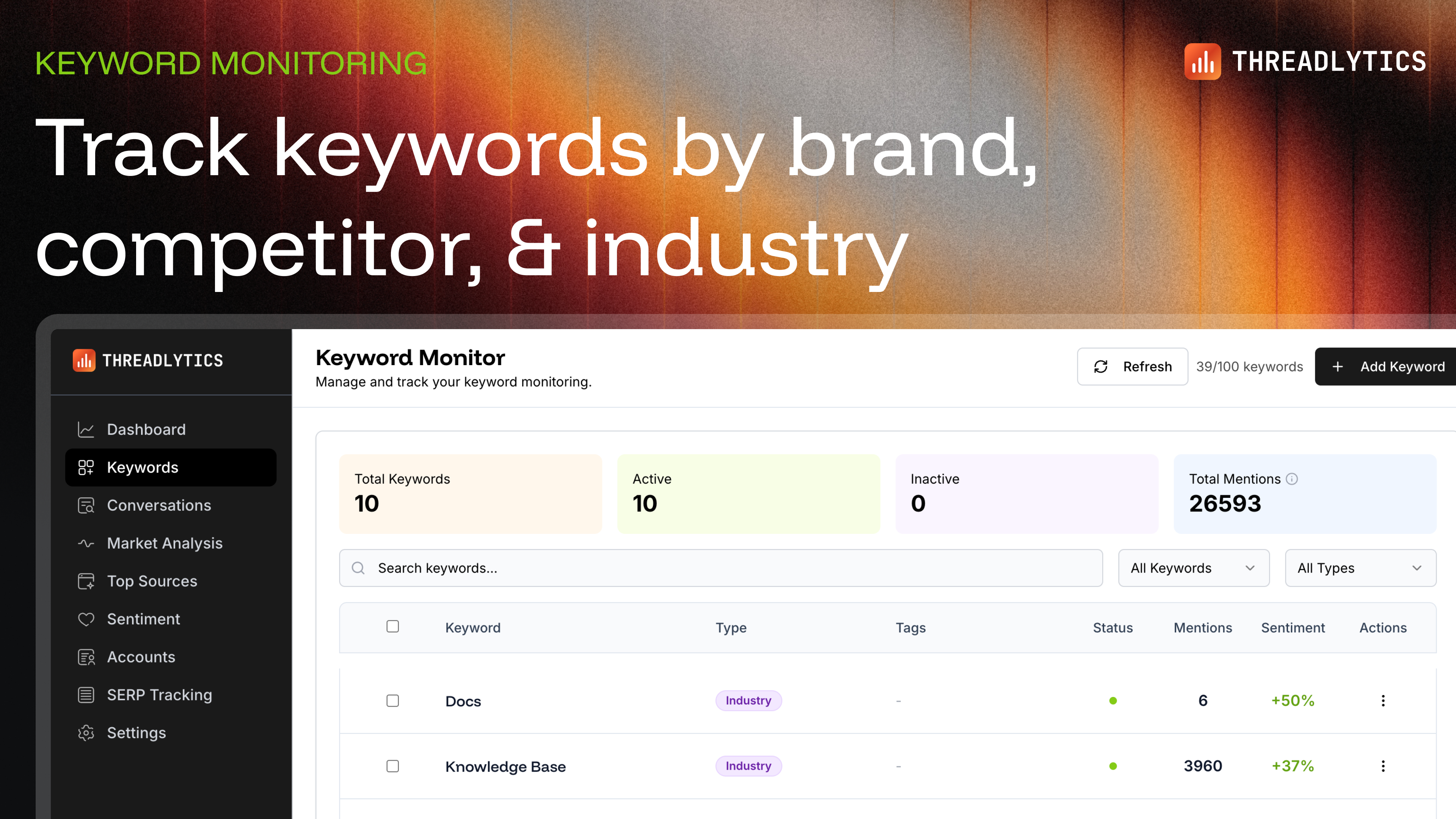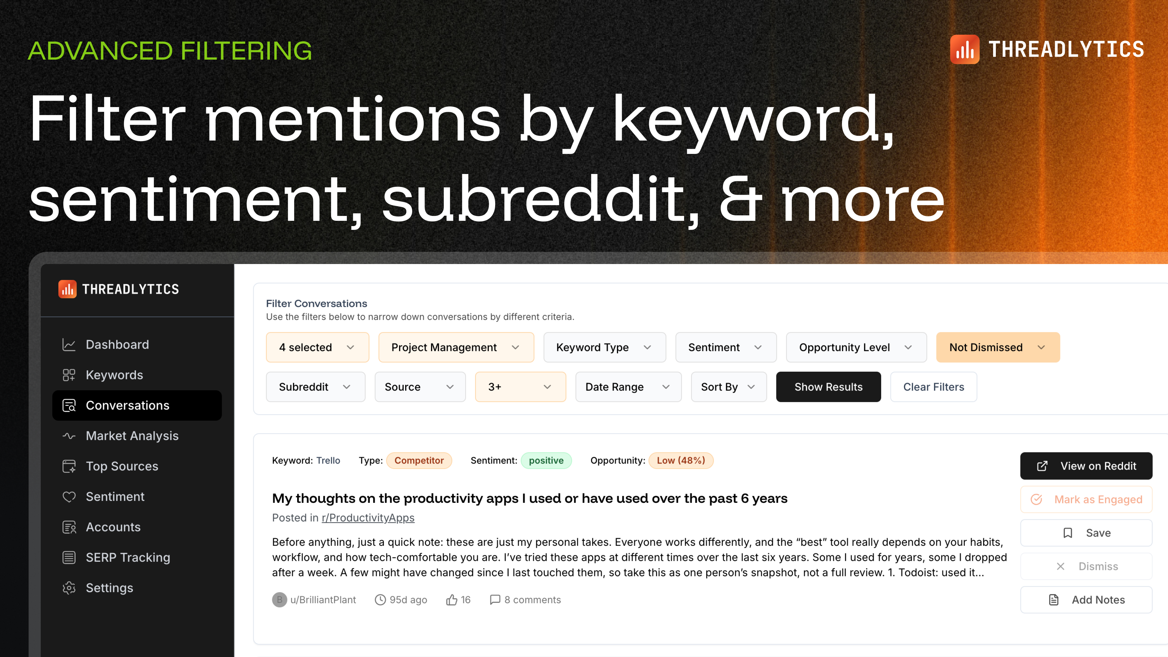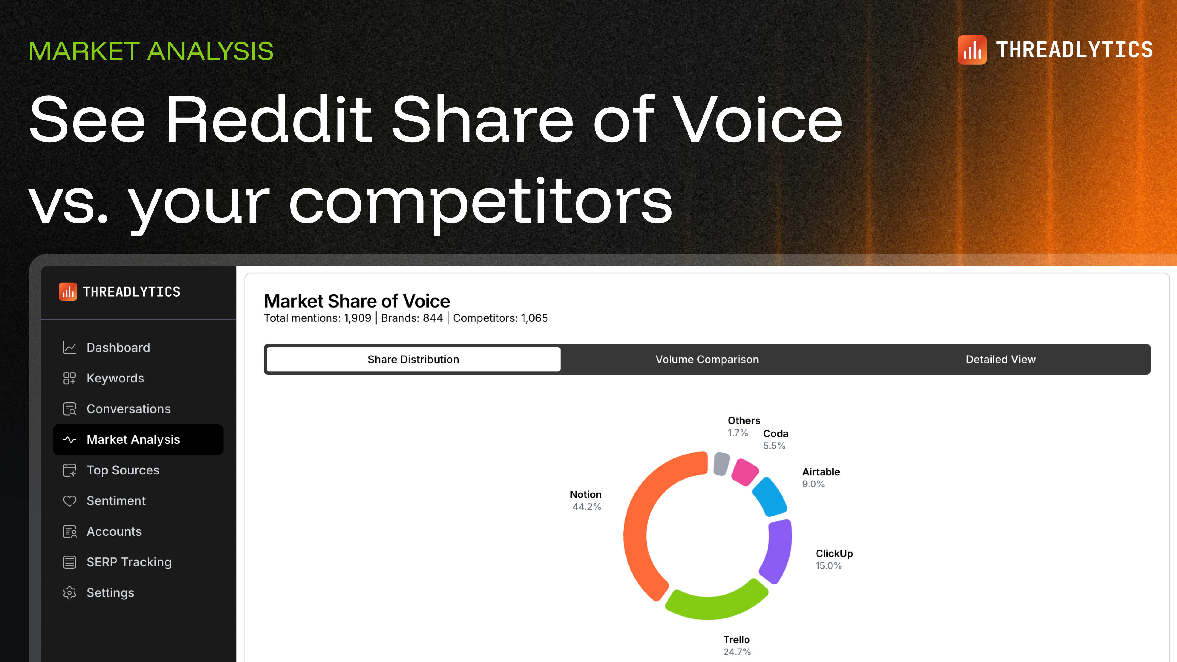 Threadlytics is a Reddit monitoring intelligence platform that helps brands understand their competitive positioning through Share of Voice analysis, monitor brand and industry keywords, track sentime