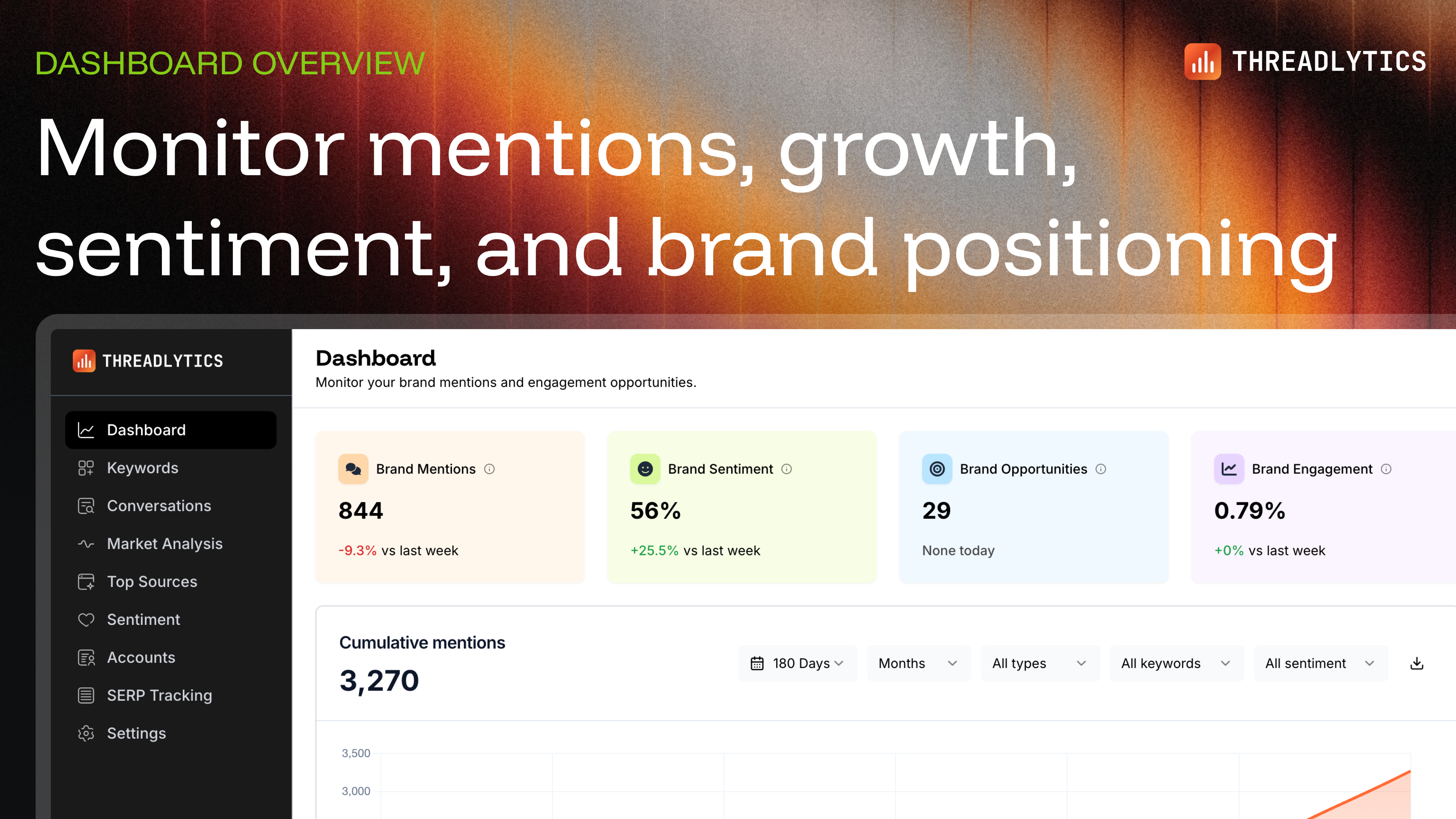 Threadlytics is a Reddit monitoring intelligence platform that helps brands understand their competitive positioning through Share of Voice analysis, monitor brand and industry keywords, track sentiment, and identify high-value engagement opportunities. Purpose-built for companies treating Reddit as a strategic marketing channel.