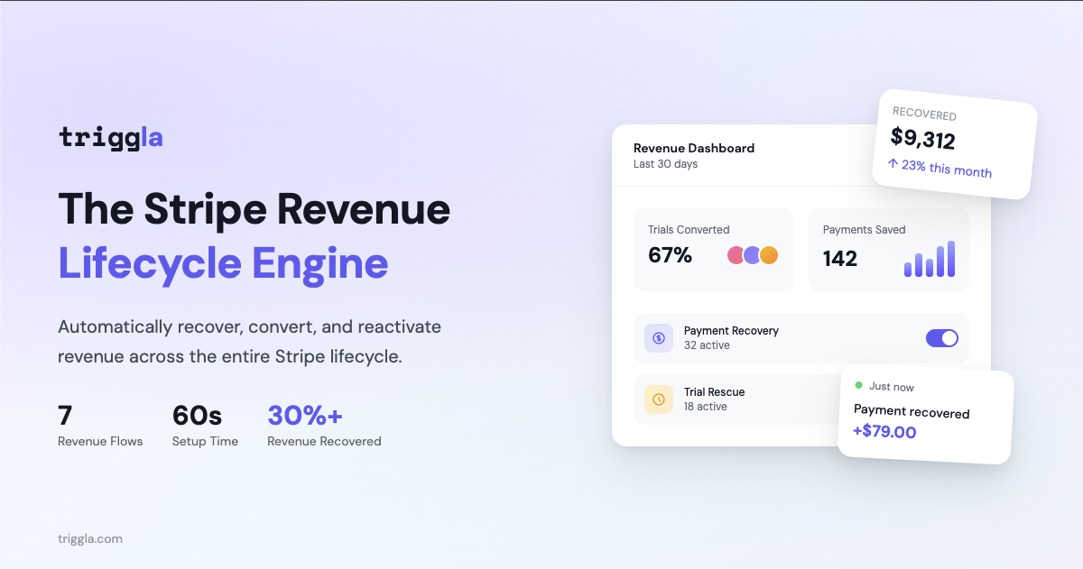 Triggla is a revenue recovery engine for Stripe businesses. It automatically recovers failed payments, converts expiring trials, wins back churned customers, and drives repeat purchases. Connect Stripe in one click, turn on the flows you need, and let it run 24/7 in the background. No code, no workflow building, no maintenance. Most Stripe businesses lose 30-40% of recoverable revenue without knowing it. Triggla fixes this with 7 pre-built flows: trial rescue, payment recovery, repeat purchase, reactivation, churn recovery, onboarding, and refund follow-up. Setup takes 60 seconds. Starts at $12/month. One recovered payment typically covers the cost.