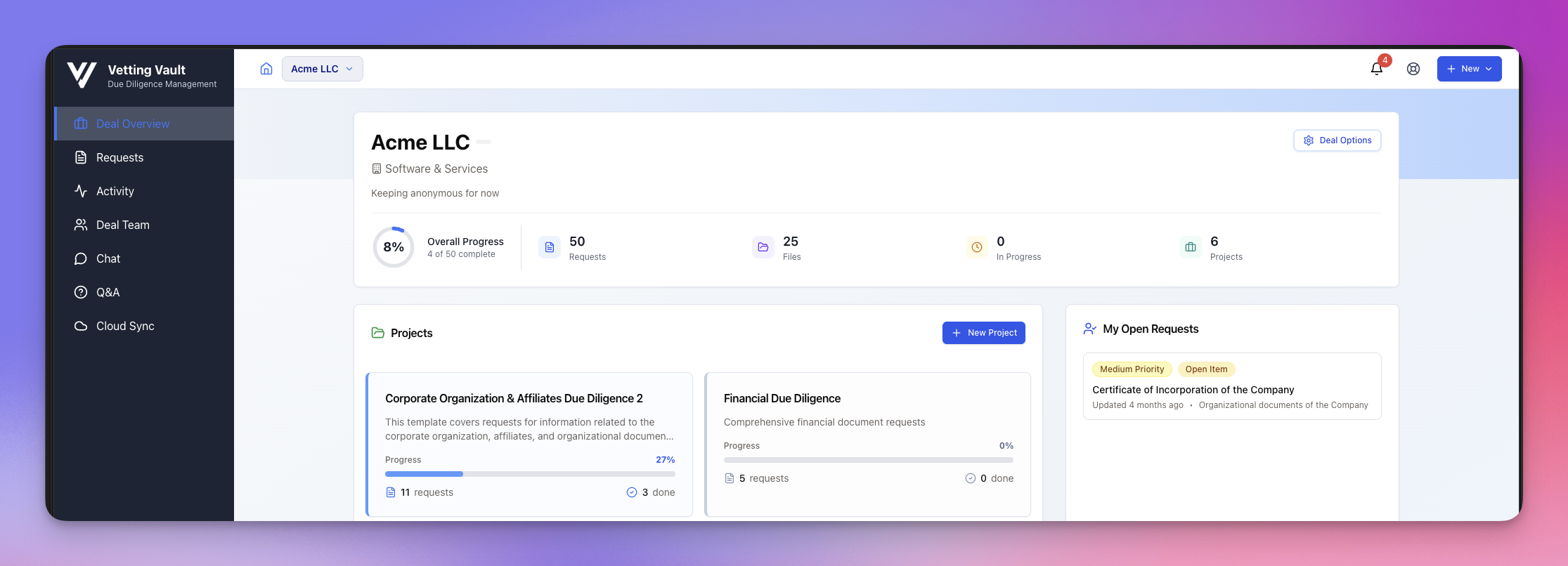 Vetting Vault is a new twist on 'virtual data rooms' for M&A / loan diligence - the request list *IS* the data room, living in the same unified place. Collaborate with your deal team so everyone is on the same page to get the transaction done - no more spreadsheet trackers or sifting through diligence emails. A key benefit of this tool is its cost-effective structure: only deal admins pay for the service ($199/mo), while all other participants can join and collaborate for free. A modern diligence platform that's secure and doesn't rack up the bill.