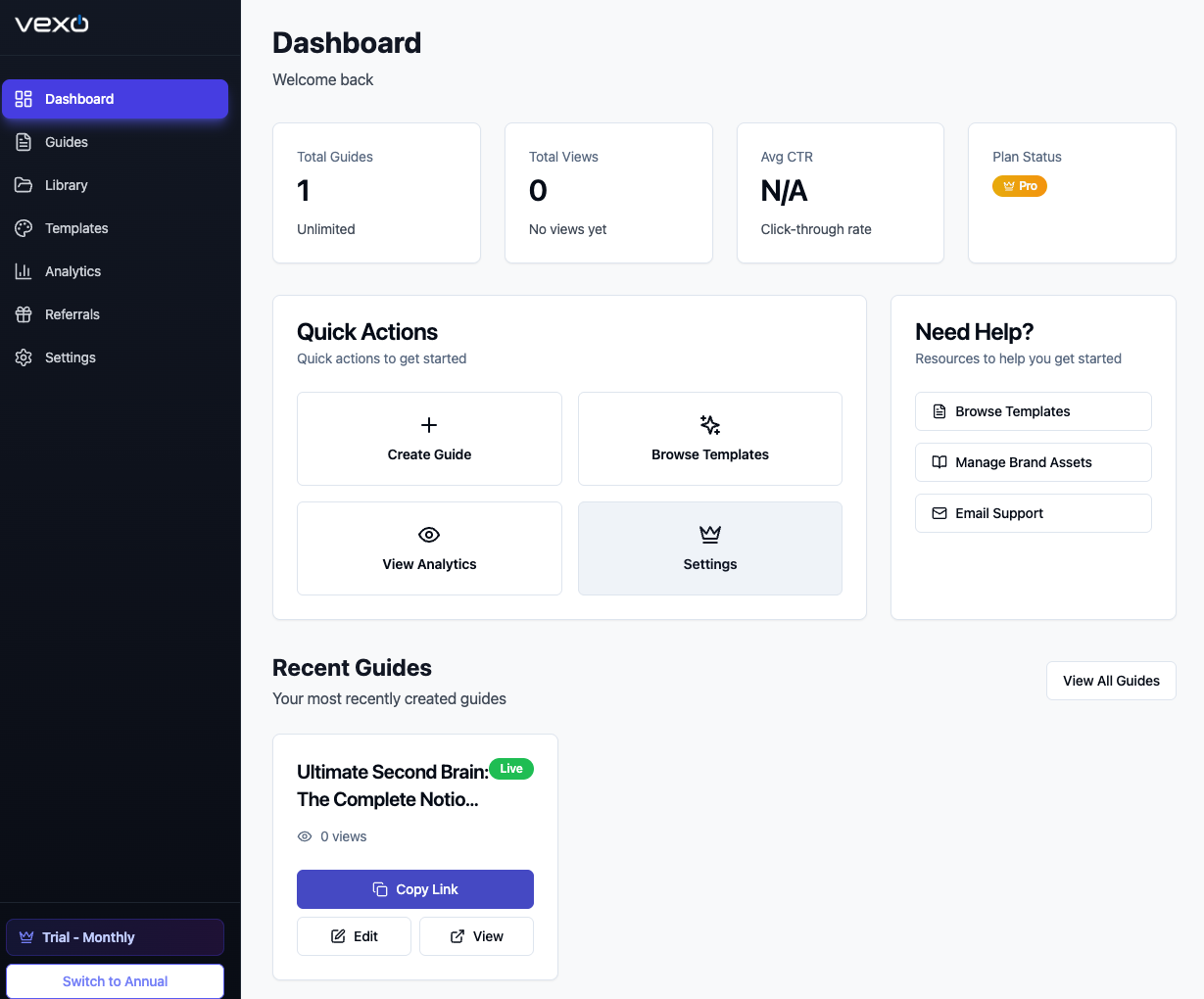 Vexo helps you create professional onboarding guides to improve the user experience of your digital products. By implementing clear and engaging guides, you can effectively reduce refund requests and cut down on support tickets. The platform is designed to help you delight your customers from the moment they start using your product, ensuring they understand the value you provide.