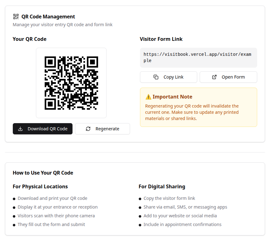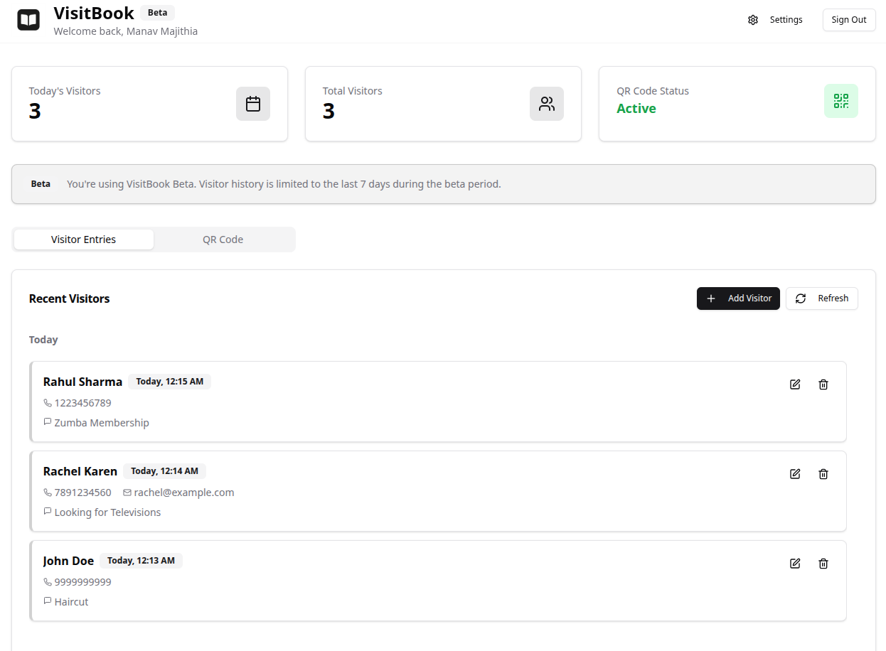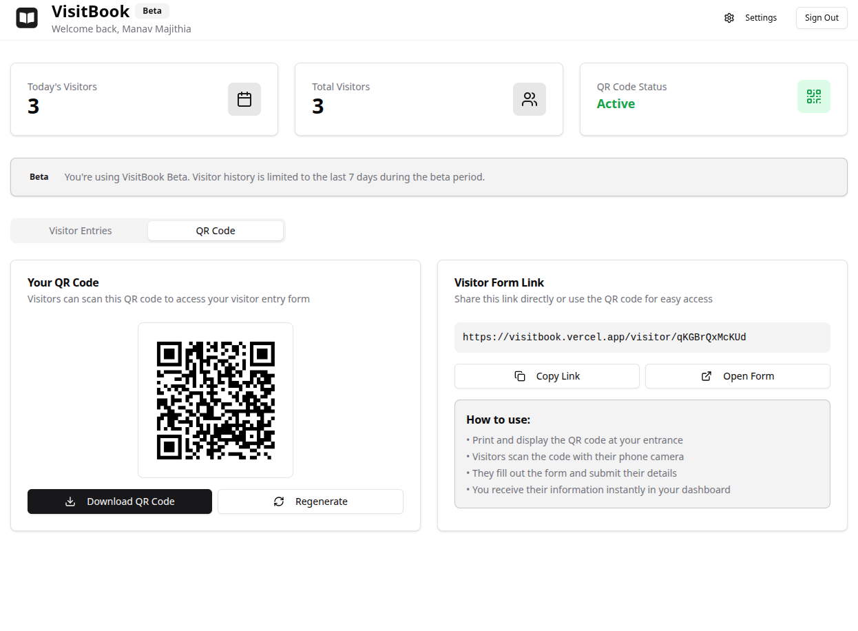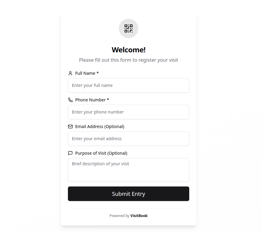 VisitBook is a modern digital guestbook that replaces traditional visitor registers with a quick, contactless, and organized check-in system. Whether you manage a space that welcomes guests, customers, or visitors — VisitBook simplifies entry logging through custom QR codes, mobile-friendly forms, and a powerful dashboard to track and manage entries. No more messy handwriting, manual errors, or missing records. Just seamless visitor management — secure, efficient, and built for today.