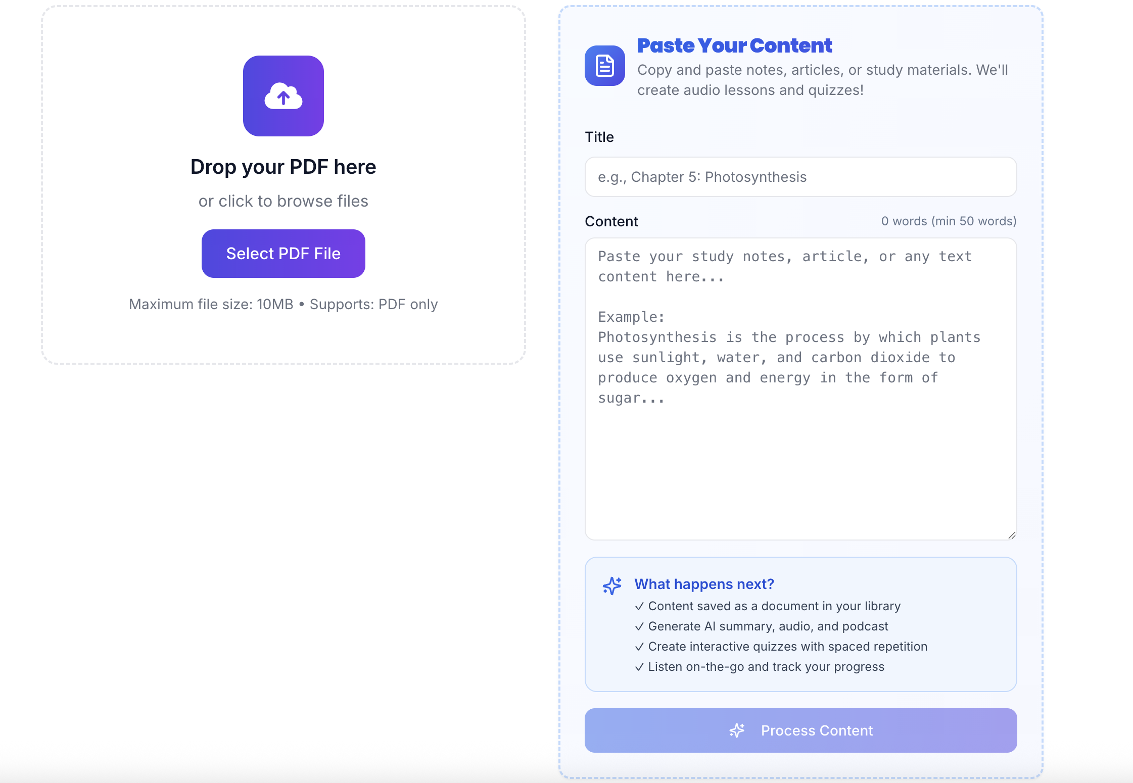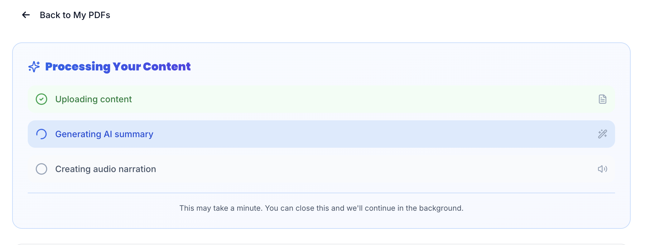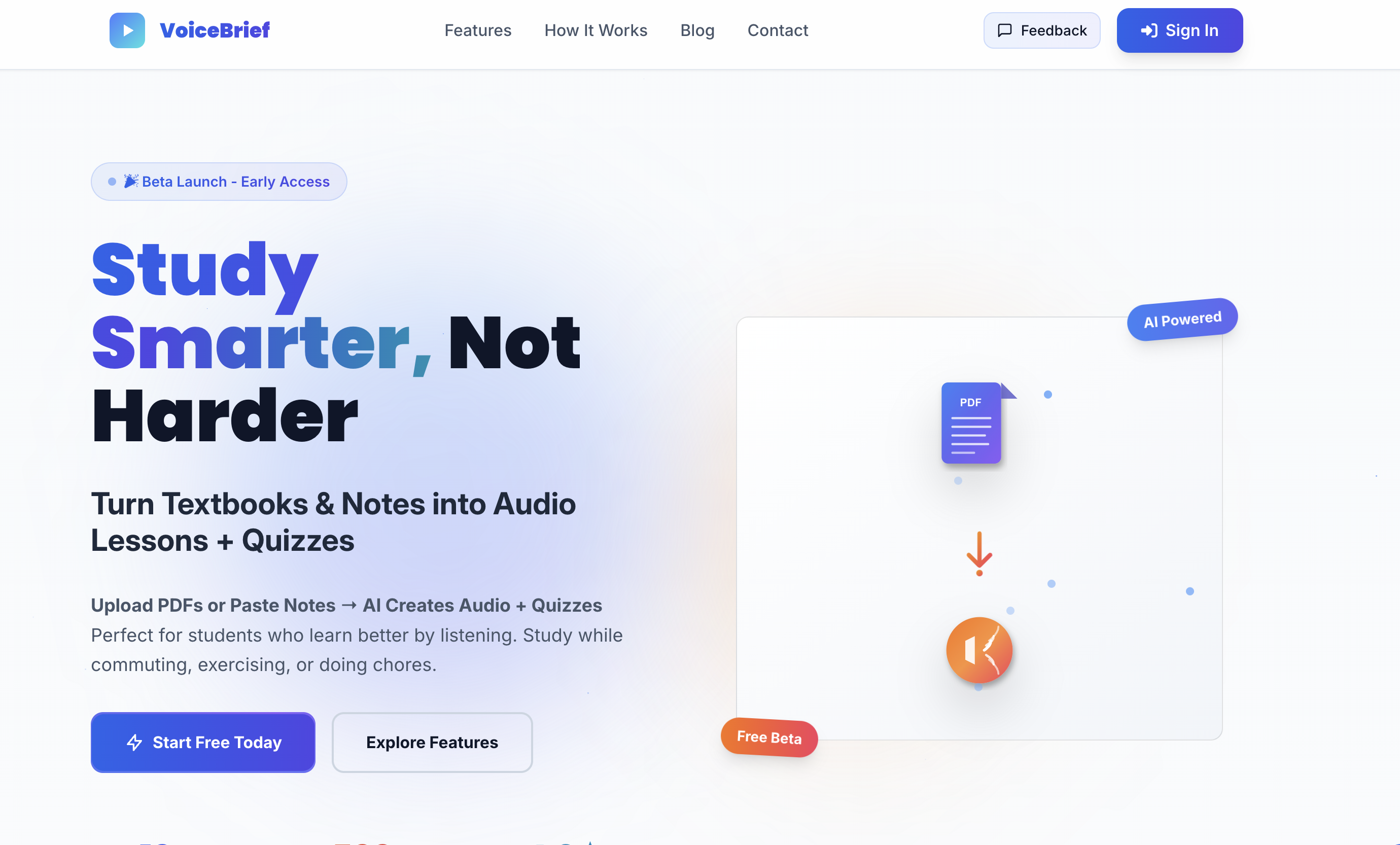VoiceBrief transforms your static PDFs into dynamic audio lessons using advanced AI. This allows you to learn efficiently while commuting, working out, or performing daily chores, making education a seamless part of your busy lifestyle. You can quickly get AI-powered summaries of your documents and test your knowledge with interactive quizzes. It solves the problem of needing to be visually engaged with text, freeing up your eyes and hands. Experience a new way to consume educational content and maximize your learning time. Free beta access is currently available, especially beneficial for students.