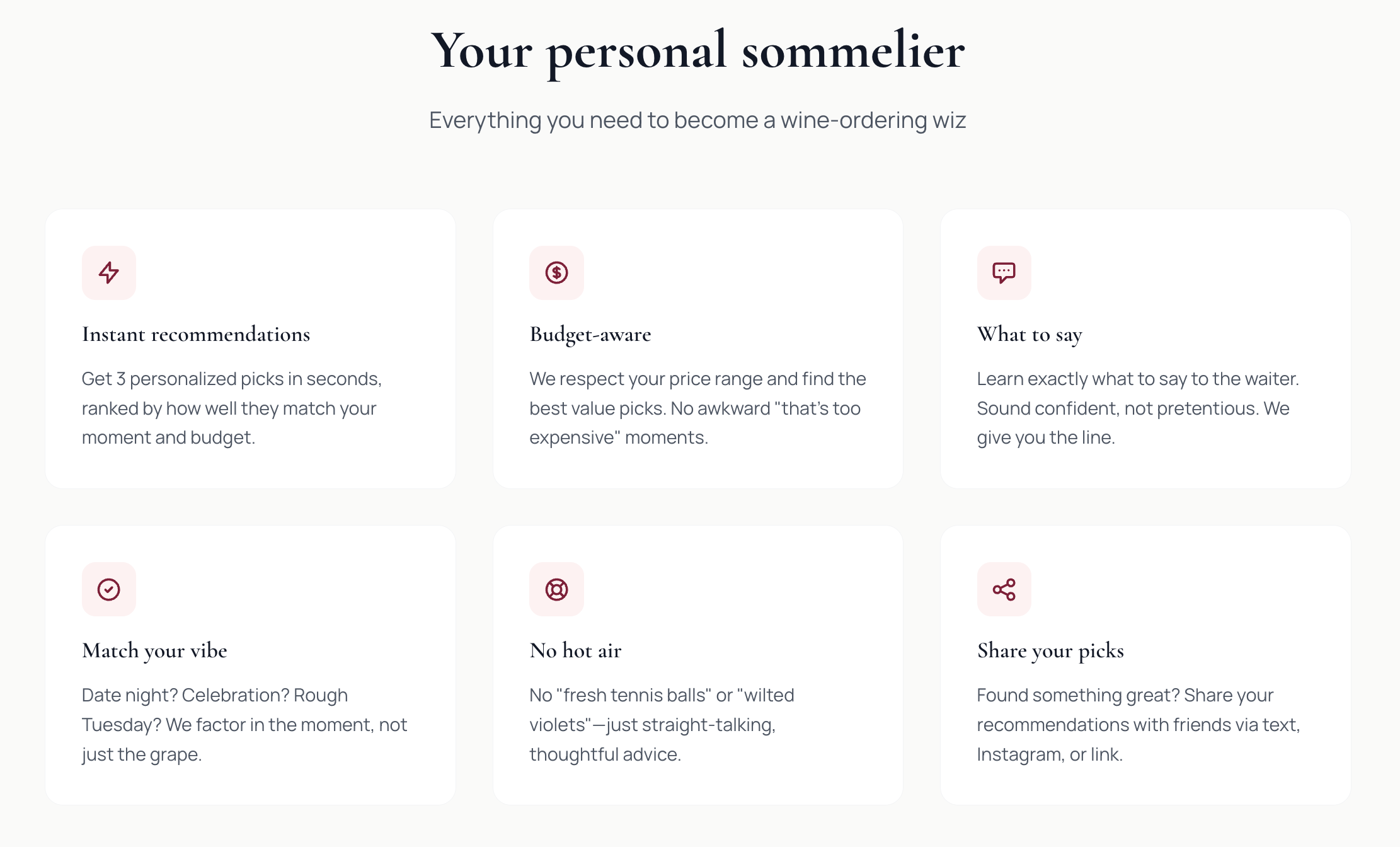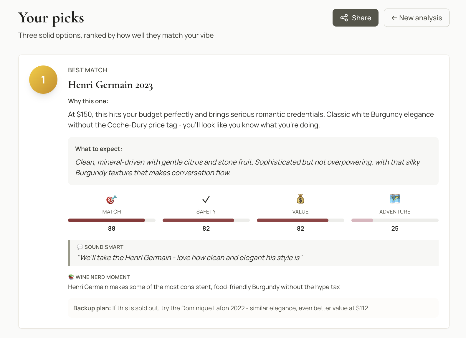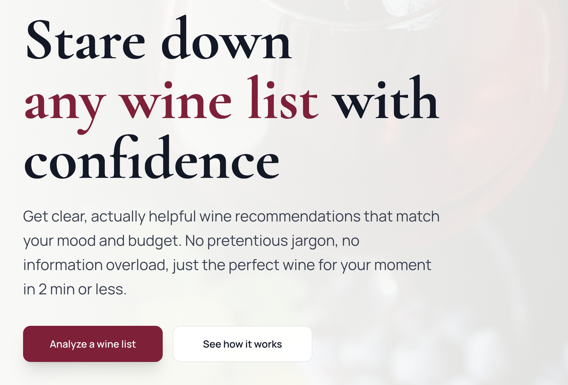 Wine Wiz lets you decode any wine list in seconds, helping you pick the right wine for your budget and mood without using star ratings or wine-world lingo. Simply take a photo of the wine list or paste text, tell Wine Wiz what you're feeling—date night, celebration, or rough Tuesday—and set your budget. You receive three clear recommendations from the list you shared, including why you'll like it in simple terms, what to expect in a straightforward way, and exactly what to say to the waiter. Enjoy no expert ratings, no searching through reviews, and no pretentious jargon. Just "order this one, here's why."