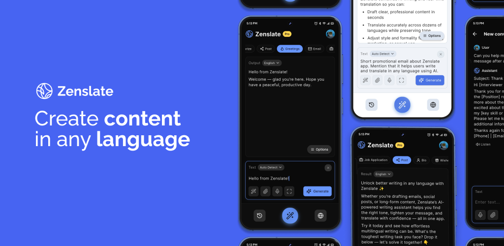 Zenslate is an AI content generator that helps you create posts, emails, and articles in 42 languages. It offers 15 writing modes, the ability to create your own custom templates, and an integrated chat assistant for brainstorming ideas. Just describe what you need, and Zenslate delivers ready, well-structured content in seconds - perfect for anyone working across languages who values speed and simplicity.